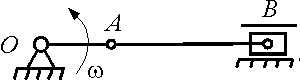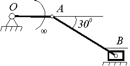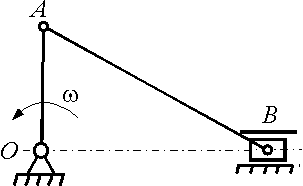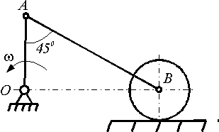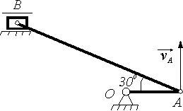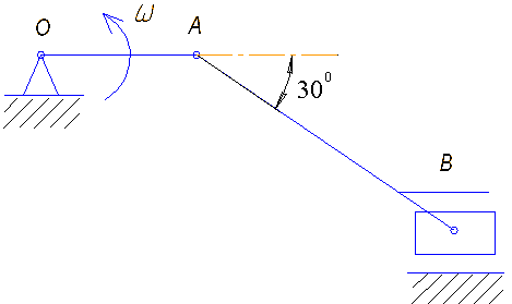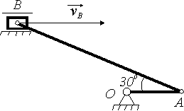 | Определить угловую скорость кривошипа ОА в указанном положении, если скорость ползуна vВ = 2,7 м/с, а длина кривошипа ОА = 0,1 м. |