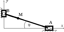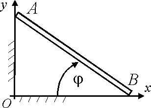 Брусок АВ скользит, опираясь концами на стену и пол. При каком угле φ в градусах скорость конца А будет в два раза больше скорости конца В? Ответ округлить до десятых. |