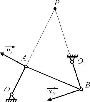 В данном положении механизма точка Р является мгновенным центром скоростей звена АВ. Определить расстояние ВР, если скорости точек А и В равны соответственно vА = 10 м/с, vB = 15 м/с, а расстояние АР = 60 см. Ответ округлить до десятых.