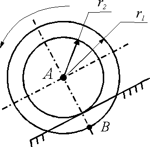 Скорость центра А ступенчатого колеса vА = 2 м/с, радиусы r1 = 0,6 м, r2 = 0,5 м. Определить скорость точки В. Ответ округлить до десятых.