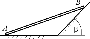 Брусок АВ скользит, опираясь концами на горизонтальную и наклонную плоскости. При каком значении в градусах угла между бруском и горизонтальной плоскостью модули скоростей его концов будут одинаковыми, если угол β = 30°. |