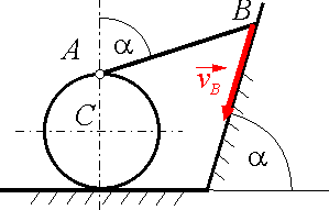 Конец В стержня АВ скользит со скоростью vB = 1 м/с по наклонной плоскости. Другой конец А шарнирно связан с роликом, который катится без скольжения. Определить скорость центра С ролика, если угол α = 60°. Ответ округлить до десятых. |