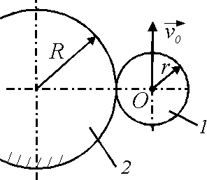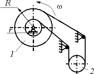 Барабан 1 лебедки вращается с угловой скоростью ω = 10 рад/с. Определить скорость центра О поднимаемой трубы 2, если радиусы R = 0,3 м, r = 0,1 м. |
