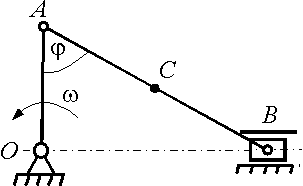 Для израдраженного положения механизма определить расстояние от точки А до мгновенного центра скоростей стержня АВ, если кривошип ОА вращается с угловой скоростью ω = 10 рад/с, а длина АВ = 0,5 м, угол φ = 60°. |