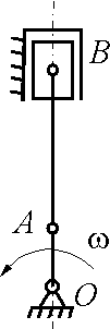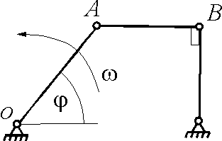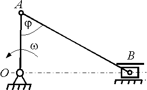 Кривошип ОА механизма, вращаясь равномерно с угловой скоростью ω = 1 рад/мин, радразует в данный момент времени с направлением ОВ угол φ = 90°. Определить угловую скорость шатуна АВ в этом положении, если ОА = 2 см, АВ = 4 см. |
