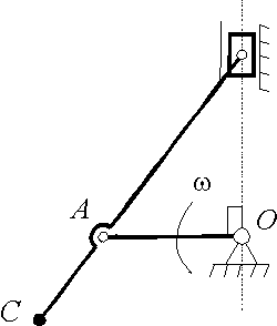 Определить угловую скорость кривошипа ОА в указанном положении, если скорость точки С шатуна vC = 4 м/с, длина кривошипа ОА = 0,2 м. |