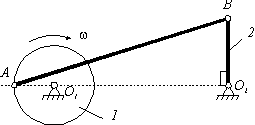 В механизме шкив 1 радиуса r =0,1 м шарнирно соединен со стержнем 2 длиной 0,25 м с помощью штанги АВ. Для данного положения механизма определить угловую скорость штанги, если частота вращения шкива 1 равна 1,20 об/мин, а расстояние О1O2 = 0,45 м. Ответ округлить до сотых. |