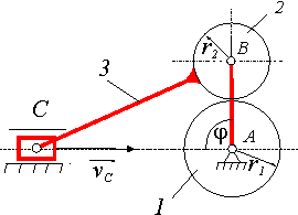 На ось А независимо друг от друга насажены шестерня 1 и кривошип АВ длиной 30 см. На оси В кривошипа установлена шестерня 2 радиуса r2 = 15 см, к которой прикреплен шатун 3. Определить угловую скорость шестерни 1 , когда угол φ = 90° и скорость vC точки С ползуна равна 0,3 м/с.