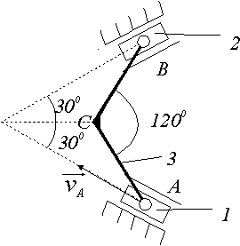 Ползуны 1 и 2, соединенные шарнирами А и В с шатуном 3, движутся по неподвижным направляющим. Определить угловую скорость шатуна в момент, когда скорость точки А равна 0,2 м/с, если длины АС = ВС = 0,2 м. |