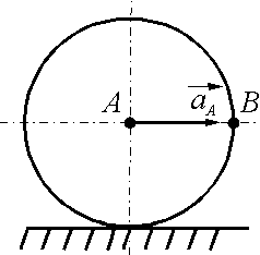 Колесо радиуса r =0,1 м катится без скольжения. Определить ускорение точки В, если центр колеса А перемещается с постоянной скоростью vA = 2 м/с. |