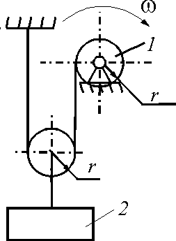 Барабан 1 вращается по закону φ = 1,5 t2. Определить ускорение груза 2, если радиус r = 2 м. |