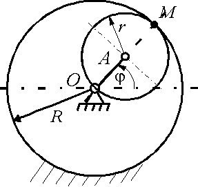 Кривошип ОА вращается согласно закону φ = 5 t. Определить ускорение точки М подвижного колеса, если радиус R = 2r = 0,2 м. |