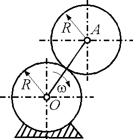 Кривошип планетарного механизма вращается с постоянной угловой скоростью ω = 1 рад/с. Определить ускорение точки, являющейся мгновенным центром скоростей подвижного колеса, если радиус R = 1 м. |