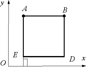 Квадратная пластина ABDE лвижется в плоскости Oxy. Определить угловое ускорение пластины в указанном положении, если длина АВ = 0,5 м, а проекции ускорений точек А и В на ось Оу соответственно равны aAy = 3 м/с2, aВy = 6 м/с2. |