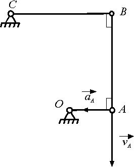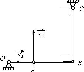 В указанном на рисунке положении шарнирного четырехзвенника скорость и ускорение точки А кривошипа ОА равны: vА = 2 м/с, aА = 40 м/с2. Определить угловое ускорение звена ВС, если длины звеньев АВ = ВС = 0,5 м. |