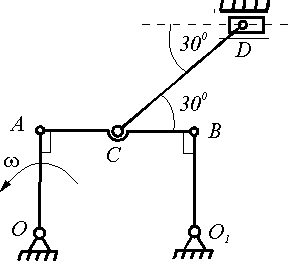 Определить угловую скорость кривошипа ОА кривошипно-ползунного механизма в указанном положении, если скорость точки D шатуна vD = 1 м/с, длина кривошипа ОА = 0,1 м. |