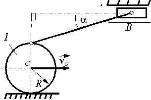 Для данного положения механизма определить ускорение ползуна В, если колесо 1 радиуса R = 50 см катится с постоянной скоростью его центра v0 = 5 м/с; угол α = 30°. Ответ округлить до десятых. |