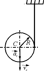 Центр цилиндра, на который намотана нить, движется по вертикали с ускорением ac = 6,6 м/с2; скорость vc в данный момент времени равна 0,66 м/с. Определить расстояние от центра С до мгновенного центра ускорений, если радиус R = 0,066 м. Ответ округлить до тысячных. |
