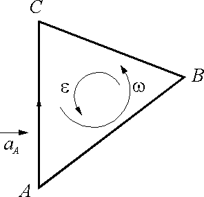 Треугольник АBС совершает плоскопараллельное движение. Определить расстояние от вершины А до мгновенного центра ускорений, если ускорение аА = 10 м/с2, угловая скорость в данный момент ω = 2 рад/с и угловое ускорение ε = 3 рад/с2. |