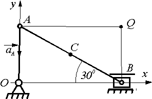 В указанном на рисунке положении шарнирного четырехзвенника скорость и ускорение точки А кривошипа ОА равны: vA = 2 м/с, aA = 20 м/с2. Определить ускорение точки В шатуна АВ, если длины АВ = ВС = 0,8 м.