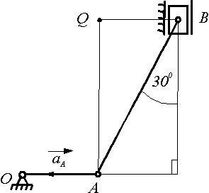 В данный момент времени внеосный кривошипно-ползунный механизм занимает положение, указанное на рисунке. Определить угловое ускорение шатуна АВ, если точка Q является его мгновенным центром ускорений, длина АВ = 0,6 м, а ускорение aA = 10 м/с2. Ответ округлить до десятых.