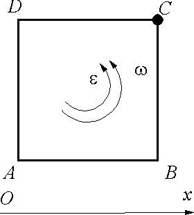 Квадрат ABCD совершает плоскопараллельное движение и в данный момент времени имеет мгновенный центр ускорений в точке А, угловую скорость ω = 1 рад/с и угловое ускорение ε = 1 рад/с2. Какой угол в градусах с осью Ох составляет вектор ускорений точки С? |