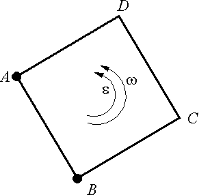 Квадрат ABCD со стороной, равной 1,2 м, совершает плоскопараллельное движение и в данный момент времени имеет мгновенный центр ускорений в точке А, угловая скорость ω = 2 рад/с и угловое ускорение ε = 3 рад/с2. Определить модуль ускорения в точке В. |