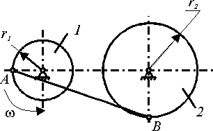 Шкив 1 радиуса r1 = 1 м и диск 2 радиуса r2 = 2 м шарнирно соединены штангой АВ. Для положения, показанного на рисунке, определить расстояние от точки В до мгновенного центра скоростей штанги. |
