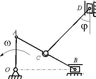 Для данного положения механизма определить расстояние от точки D до мгновенного центра скоростей звена СD длина которого СD = 4 м, φ = 30°. |