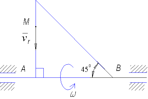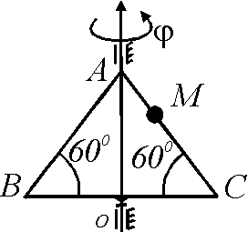 По стороне треугольника, вращающегося вокруг стороны АВ с угловой скоростью ω = 8 рад/с, движется точка М с относительной скоростью vr = 4 м/с. Определить модуль ускорения Кориолиса точки М. |