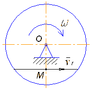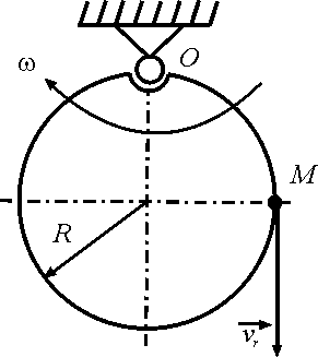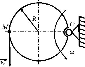 Точка М движется по ободу диска, радиус которого К = 0,8 м, со скоростью vr =