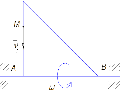По стороне треугольника, вращающегося вокруг стороны АВ с угловой скоростью ω = 4 рад /с, движется точка М с относительной скоростью vr = 2 м/с. Определить модуль ускорения Кориолиса точки М, если угол α = 30°.