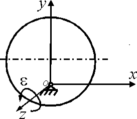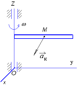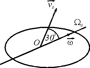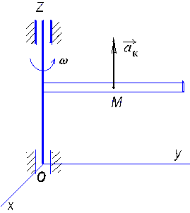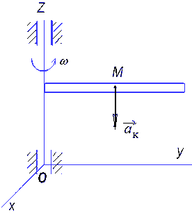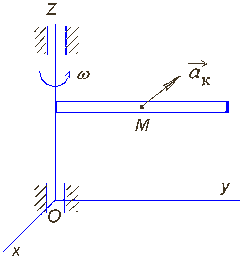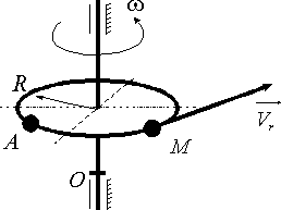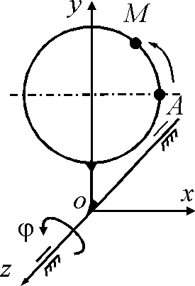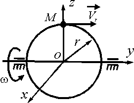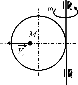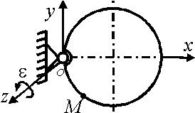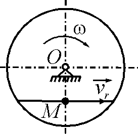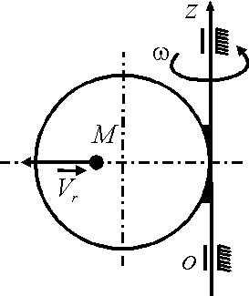Диск вращается равноускоренно вокруг оси Оz с угловым ускорением ε = 2 рад/с2. С какой скоростью по ободу этого диска должна равномерно двигаться точка М, чтобы в момент времени t = 1 с ускорение Кориолиса этой точки было равно 20 м/с2, если начальная угловая скорость диска равна 3 рад/с. (2)
