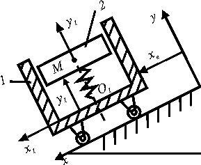 Тележка 1 движется по наклонной плоскости по закону хе = 0,5t2. Внутри тележки движется ползун 2 по закону у1 = 1 + 0,05 sin 0,25 πt. Определить абсолютную скорость точки М ползуна 2 в момент времени t = 0,1 с. Ответ округлить до тысячных.
