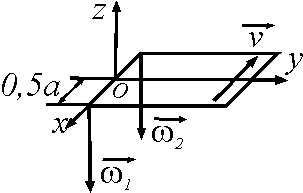 Квадратная пластина со стороной а = 0,5,м участвует одновременно в поступательном движении со скоростью v = 3 м/с и двух вращательных движениях с угловыми скоростями ω1 = ω2 = 4 рад/с. Определить модуль абсолютной поступательной скорости пластины. Ответ округлить до сотых.