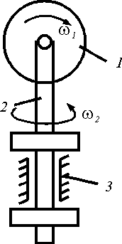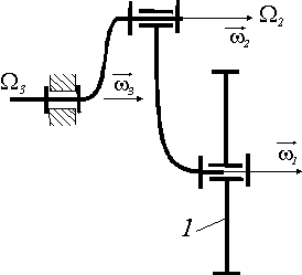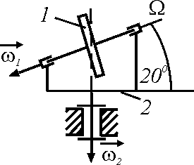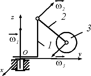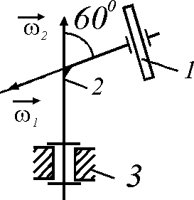 Диск 1 вращается на изогнутой оси 2 с угловой скоростью ω1 = 4 рад/с. Скорость вращения оси 2 в подшипнике 3 равна ω2 = 4 рад/с. Определить модуль абсолютной угловой скорости диска. |