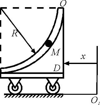 Определить переносную скорость (м/c) точки М при её сложном движении в момент времени t = 2 c. Движение тела D задаётся уравнением x = t 3 + 4 t. Движение точки М, относительно движущегося тела D, задано уравнением s = 4 π t 2, R = 48 см (x – см, ОМ – см, s – см). Положительное значение координаты s = ОМ отсчитывается от точки О в сторону ближайшего, указанного на рисунке, положения точки М. Ответ округлить до сотых.