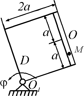 Определить относительную скорость (м/c) точки М при её сложном движении в момент времени t = 2/3 c. Движение тела D задаётся уравнением φ = 2 t 3 − t2. Движение точки М, относительно движущегося тела D, задано уравнением s = 18 sin ( π t/4 ), a = 25 см (φ – рад, ОМ – см, s – см). Положительное значение координаты s = ОМ отсчитывается от точки О в сторону ближайшего, указанного на рисунке, положения точки М. Ответ округлить до сотых.