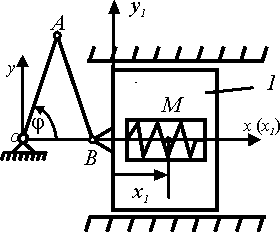 Кривошип OA вращается по закону φ = πt/3. Заданы длины стержней ОА = АВ = 0,25 м. Относительное движение точки М по ползуну 1 задано уравнением x1 = 0,3 + 0,1 sin(πt/6). Определить модуль абсолютной скорости точки М в момент времени t = 1 с. Ответ округлить до сотых.