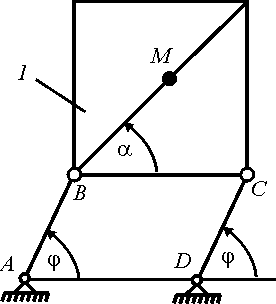 Определить абсолютную скорость точки М в момент времени t = 1 с, если ее движение по квадратной пластине 1 задано уравнением ВМ = 0,1t2. Кривошипы АВ = СD = 0,5 м вращаются по закону φ = 0,25 πt. Ответ округлить до тысячных. |