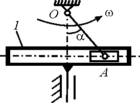 Кривошип ОА = 0,2 м вращается вокруг оси О с угловой скоростью ω = 20 рад/с и приводит в движение кулису 1, движущуюся поступательно. Найти скорость кулисы при угле α = 30°. |