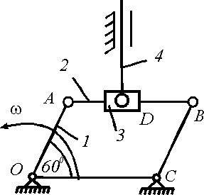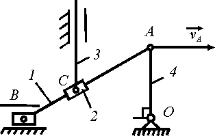 шарнирно прикреплен стержень 4. Для данного положения механизма определить скорость стержня 4, если скорость точки А кривошипа 1 равна 2 м/с.