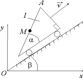 Тело 1 движется по наклонной плоскости равномерно со скоростью v = 2 м/с. Точка М относительно тела 1 движется согласно уравнению АМ = 0,5 t. Определить координату хM точки М в момент времени t = 2 с, если при t = 0 координата хM = 0, углы α = β = 30°. Ответ округлить до сотых. |