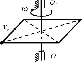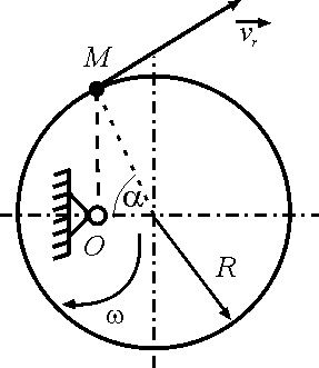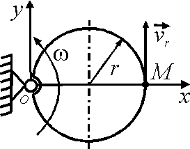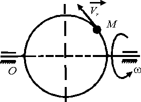 Диск вращается вокруг оси Оz. По его ободу движется точка М с постоянной относительной скоростью vz = 9 м/с. Определить переносную скорость точки М в момент, когда ее абсолютная скорость равна 15 м/с. |