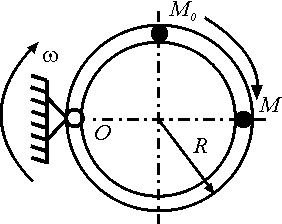Кольцо вращается вокруг оси О, перпендикулярной плоскости чертежа, с постоянной угловой скоростью ω = 4 рад/с. Находящийся в кольце шарик М движется по закону М0М = 0,2 t. Определить абсолютную скорость шарика в указанном на чертеже положении, если радиус R = 0,1 м. |
