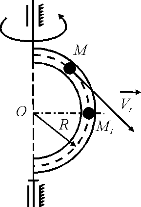 В трубке, имеющей форму полуокружности, движется шарик М с постоянной скоростью vr = 3 м/с. Определить модуль абсолютной скорости шарика в положении М1, если трубка вращается с угловой скоростью ω = 3 рад/с, а радиус R = 1 м. Ответ округлить до сотых. |