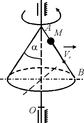 Конус вращается вокруг оси Оz с угловой скоростью ω = 3 рад/с. По его образующей с постоянной скоростью vr = 4 м/с движется точка М в направлении от A к B. Определить модуль абсолютной скорости этой точки в положении, когда расстояние АМ = 2 м, если угол α = 30°. |
