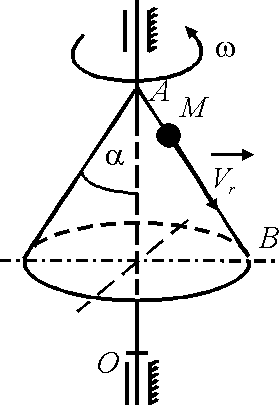 Конус вращается вокруг оси Оz с угловой скоростью ω = 3 рад/с. По его образующей с постоянной скоростью vr = 4 м/с движется точка М в направлении от A к B. Определить модуль абсолютной скорости этой точки в положении, когда расстояние АМ = 2 м, если угол α = 30°.