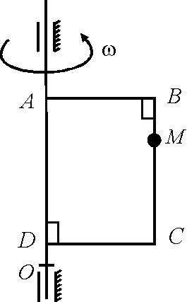 По стороне АВ прямоугольной пластины, вращающейся в плоскости чертежа, движется точка М по закону АМ = 3 sin (π/3)t. Определить угловую скорость пластины ωе в момент времени t = 2 с, если ускорение Кориолиса в точке М в этот момент равно 4 π м/с2.