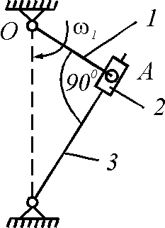 Кривошип 1 длиной ОА = 0,8 м вращается с угловой скоростью ω1 = 5 рад/с вокруг оси О. В положении, указанном на рисунке, определить скорость ползуна 2 относительно кулисы 3.